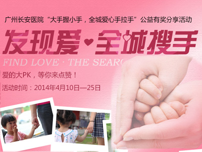 近日,由广州圣丹福医院举办的”发现爱·羊城搜手“点赞有奖大pk全面启动。据悉,广州圣丹福医院以“治不孕·到圣丹福”配合“大手握小手“的品牌广告,首次在羊城各候车亭、报纸、车身、报刊亭、网站等渠道率先发布,让人耳目一新, 获得人们一致好评,续写着羊城爱的故事。为了让爱的正能量传递更远,圣丹福医院特举办此次”大手握小手,全程爱心手拉手“公益有奖分享活动。