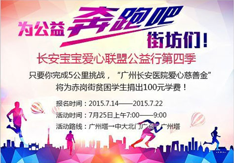 7月圣丹福宝宝公益行再行动,将在7月25日举办“广州圣丹福医院公益助跑活动·赤岗站”活动,从广州新地标广州塔起跑,沿江边绿岛跑至著名学府中山大学北门广场后返回广州塔,全程5公里,只要每一名参于者完成该路程,“广州圣丹福医院爱心慈善金”即为贫困学生捐出100元学费。
