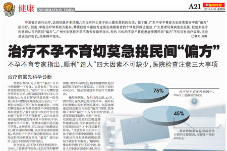 喻早举例称,有个江西女孩,22岁,因为内分泌失调已经闭经半年,刚开始的时候她并没有到医院就诊,而是选择通过身边朋友介绍的“偏方”调理,结果喝了半年“偏方”不仅没有治疗效果,人还变得越来越胖,来到广州圣丹福医院进行检查后发现是雄性激素过高,在明确病因后进行系统的诊疗,5个月后顺利怀孕。“目前很多夫妇怀不上孩子都会寻求中医调理,但是不建议在没有诊断病因的情况下就盲目用偏方。”喻早称,像这样的例子并不在少数,很多人对医院有恐惧心理,所以就求助“偏方”,以为“偏方”用起来方便而且便宜,但是如果没有经过医生严谨的辩证施治,结果可能会得不偿失。