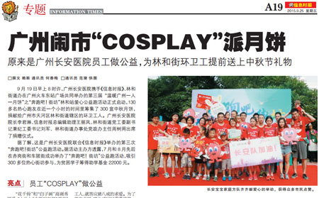 “花千骨”和“白子画”高调秀恩爱、“七仙女”合影时各种“恶意”卖萌、“嫦娥仙子”怀抱玉兔“下凡”与市民互动、“唐僧师徒”西天取经归来……这是本次爱心公益跑活动的大亮点:由广州圣丹福医院医护人员通过Cosplay的形式,现场派月饼做公益。